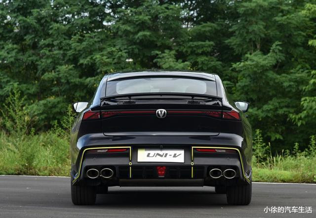 长安UNI-V为UNI系列轿车独款,承袭家族未来感设计,中网无边界,辨识度高且酷炫。车身配空气动力学套件,车尾有升降尾翼,尾灯贯穿,溜背设计,双边四排气,获称小A7。